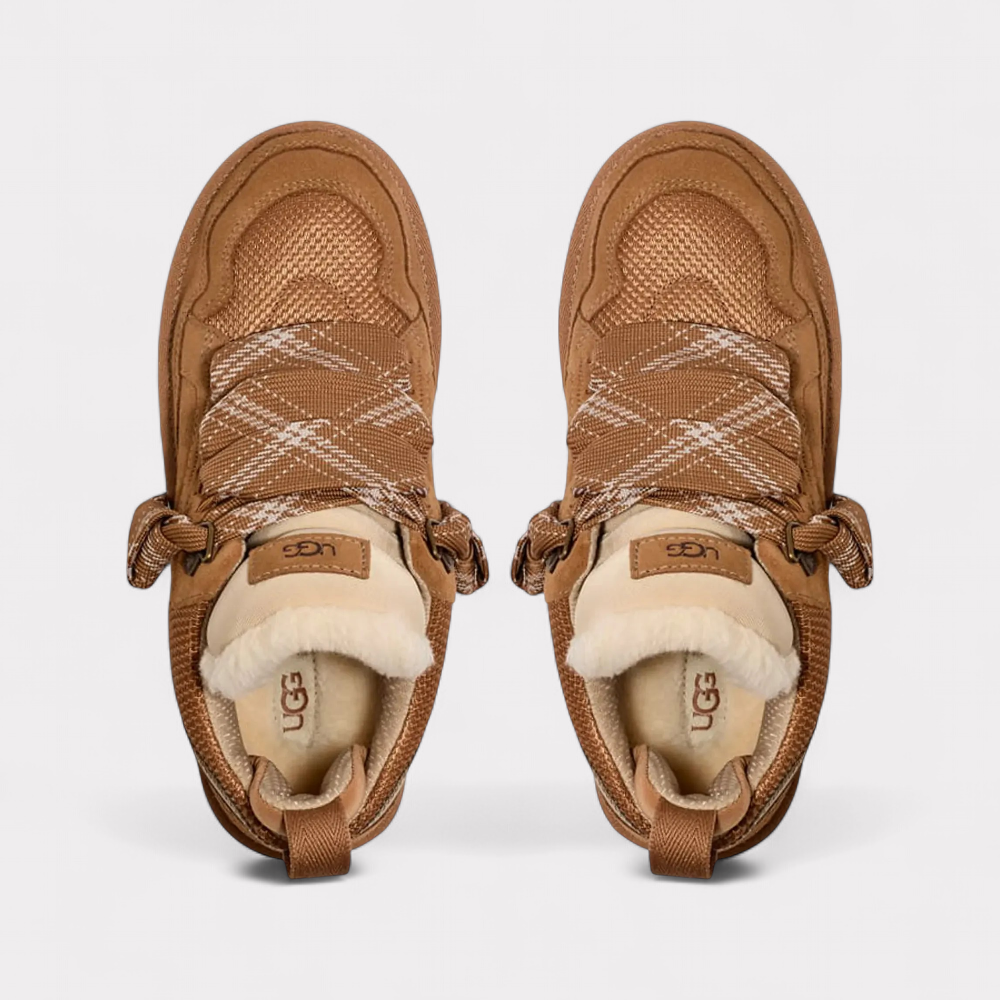 Der UGG Lowmel ist ein moderner, lässiger Schnürschuh, der den Komfort von UGG mit einer sportlich-urbanen Silhouette verbindet. Das Modell kombiniert strapazierfähiges Ballistic Canvas Mesh mit weichem Veloursleder und bietet so eine ausgewogene Mischung aus Robustheit und Flexibilität. Die charakteristische Low-Top-Form erinnert an eine Mischung aus Boot und Sneaker und sorgt für vielseitige Einsatzmöglichkeiten im Alltag. Typisch für UGG setzt auch der Lowmel auf nachhaltige Materialien – etwa durch den Einsatz von EVA-Schaum auf Basis von regenwasserangebautem Zuckerrohr anstelle von Erdöl. Recycelte Schnürsenkel und dezente Markenlogos auf Zunge und Ferse unterstreichen den cleanen, modernen Look. Der Lowmel vereint funktionales Design, umweltbewusste Herstellung und den unverwechselbaren Tragekomfort, für den UGG weltweit bekannt ist.